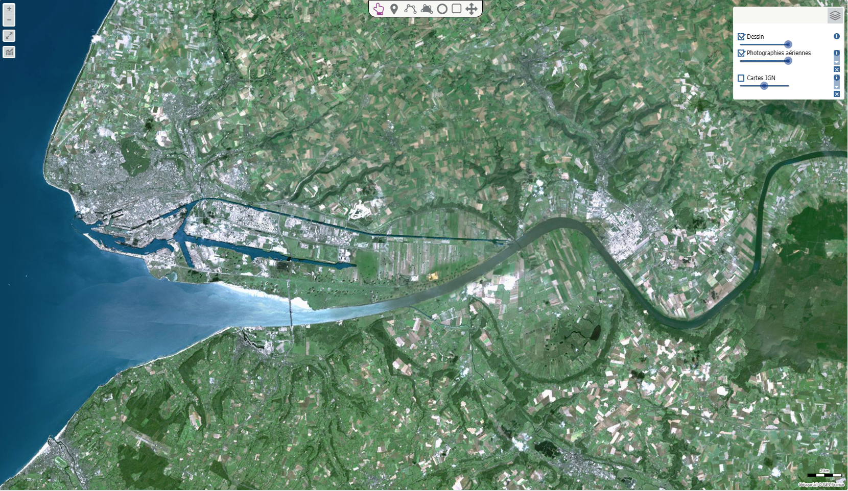 Cette vue permet d’identifer l’estuaire de la Seine, le polder industrialo-portuaire, le canal de Tancarville,