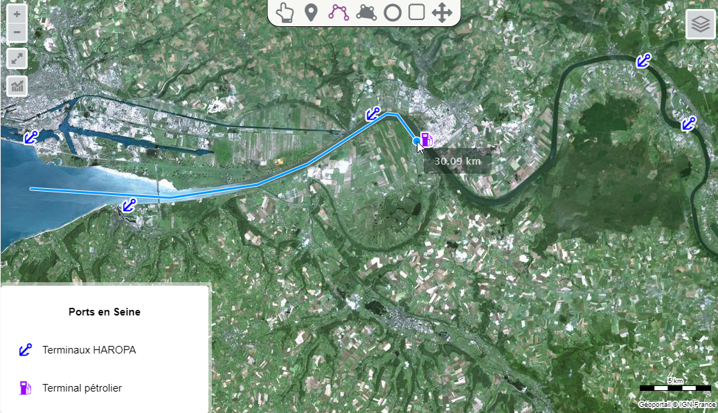 - Mesurer la distance entre Gennevilliers et le Havre, ou encore la partie maritime de la Seine (entre le Pont Guillaume le Conquérant de Rouen et Le Havre), ou plus ponctuellement entre Le Havre et un terminal précis (Port-Jérôme dans l'exemple suivant).