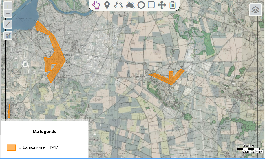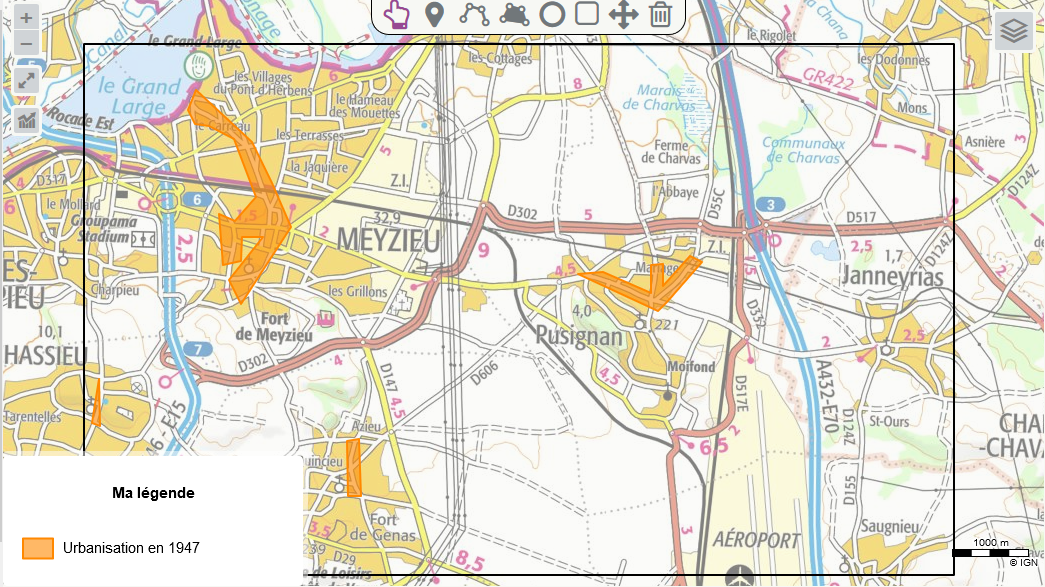 Afin de réaliser l'activité, le professeur met à disposition des élèves, un fichier à télécharger avec la zone de travail délimitée par un cadre noir et un début de légende avec les zones urbanisées en 1947.