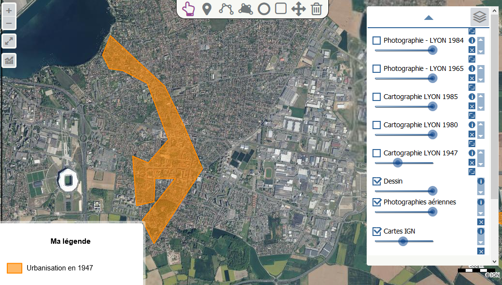 La carte topographique de 1947 permet de dessiner l'urbanisation présente en 1947 et mesurer ainsi l'étalement urbain à l'aide de la photographie aérienne en transparence.