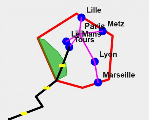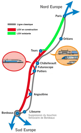 ![]() Schéma présentant l’intégration du nouveau tronçon LGV, dans le réseau ferré préexistant |