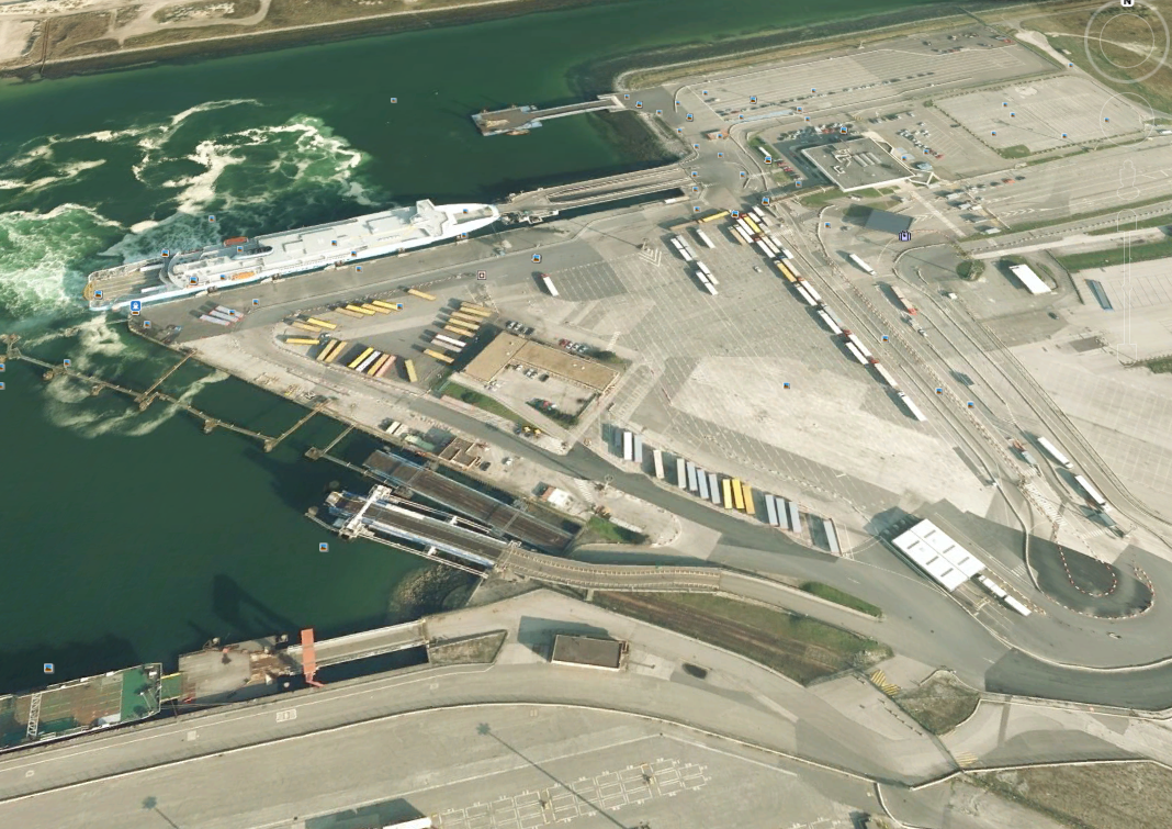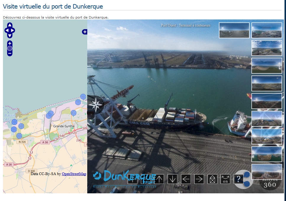 La ressource Édugéo propose de nombreuses photographies aériennes verticales dont l'interprétation n'est pas toujours facile pour les élèves. Il peut-être ici intéressant d'utiliser dans le même temps des images aériennes obliques pour visualiser ces équipements. Le site du port de Dunkerque propose une visite virtuelle insérable dans le fichier Édugéo. Cliquez sur l'icône de l'appareil photo